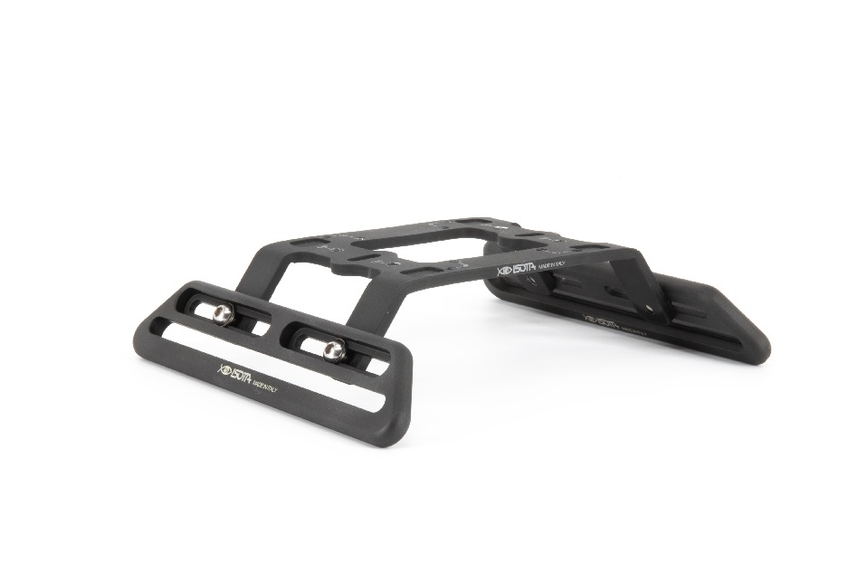 - Schraubbare Gleitschuhe, die in verschiedenen Positionen entlang der Schiene arretiert werden können, um den Schwerpunkt der Ausrüstung anzupassen
