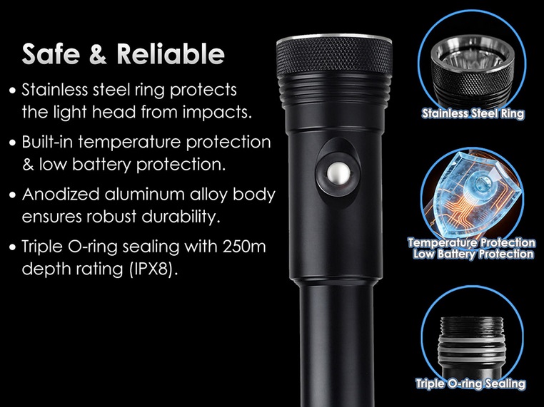 - Tiefengeeignet: 250 m, IPX8 (JIS-Schutzklasse 8)