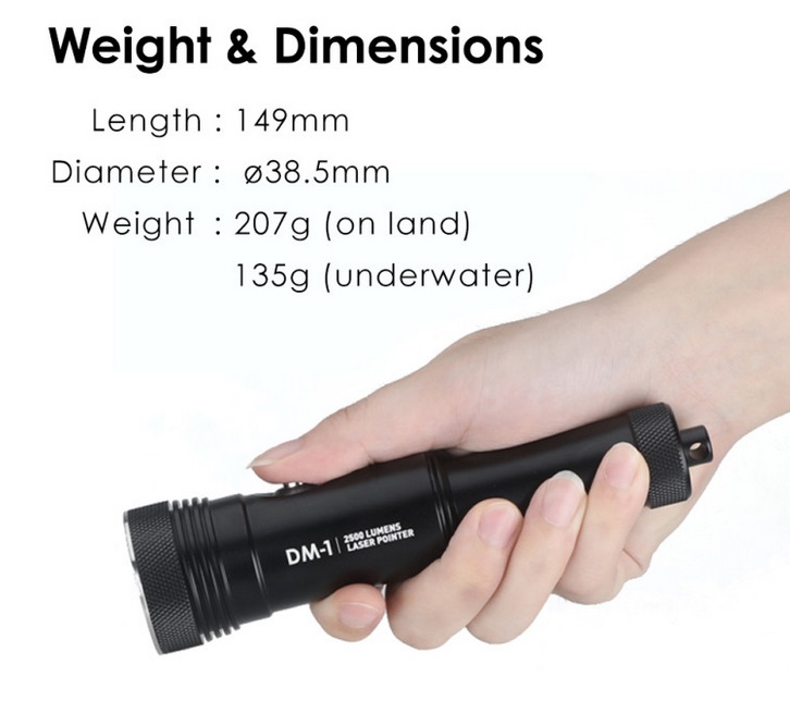 DM-1 Tauchlampe: Wiederaufladbare LED mit 2500 Lumen und 5 mW grünem Laser, heller als leistungsstarke Alternativen auf dem Markt. Einhandbedienung, integrierte Batterieanzeige, entwickelt für professionelle Taucher.