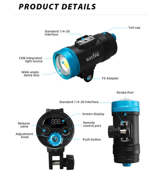 The equipment is equipped with a one-way safety drain valve that increases the safety factor under extreme conditions. The light has an automatic shut-off function and a strobe function with the brand new Weefine patent, which can meet the various needs of the user.