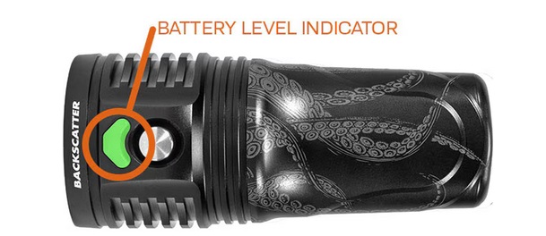 La Backscatter Octo 3500 utilise une interface simple à un seul bouton, ce qui en fait l'une des lampes sous-marines les plus faciles à utiliser. Allumez-la en appuyant cinq fois rapidement, appuyez pour passer d'un niveau de luminosité à l'autre ou en mode veille, et maintenez enfoncé pour l'éteindre.