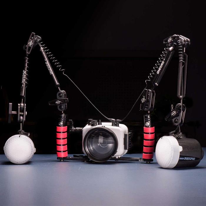Ajoutez deux flashs pour éclairer efficacement tout ce qui se trouve sur votre chemin sous l'eau. Ce kit est optimisé pour une utilisation avec les appareils photo OM System TG-7, Olympus TG-6 et TG-5, que vous utilisiez un boîtier sous-marin Ikelite ou un OM Olympus PT-059.