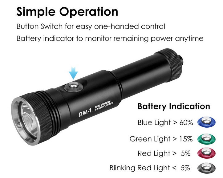 Lampe de plongée DM-1 : LED rechargeable de 2500 lumens avec laser vert de 5 mW, plus lumineuse que les alternatives haute puissance disponibles sur le marché. Commandes à une main, indicateur de batterie intégré, conçue pour les plongeurs professionnels.