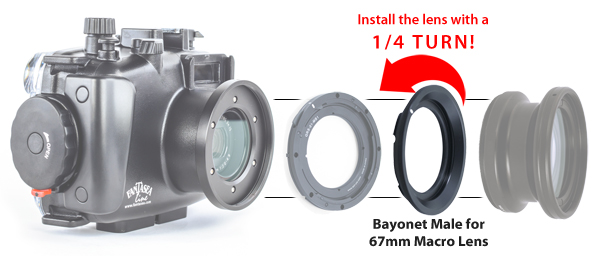 La baionetta macro maschio da 67 mm è una baionetta maschio che può essere montata su quasi tutti gli obiettivi macro "bagnati" con filettatura da 67 mm. Quando la baionetta è montata sull'obiettivo macro, l'obiettivo può essere facilmente rimosso dall'innesto del corpo macchina o dall'innesto dell'obiettivo con 1/4 di giro*.