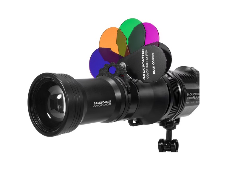 Trasforma il potente flash ibrido ad ampio raggio in uno strumento di illuminazione preciso. Perfetto per qualsiasi soggetto, dai minuscoli soggetti macro ai ritratti di pesci e persino allo snooting grandangolare, lo snoot ottico OS-3 ti offre il controllo completo della luce grazie a una ghiera di apertura rimovibile e rotante e a uno slot inseribile per i filtri colorati Backscatter, che consentono di ottenere effetti creativi.